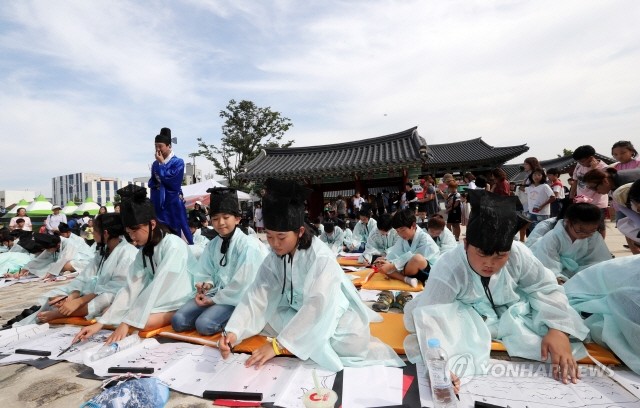 9일 오후 강원 강릉 대도호부 관아 동헌 앞마당에서 열린 '율곡 이이, 인재를 뽑다' 과거시험 체험행사에 참여한 초등학교 학생들이 그림 그리기, 시 짓기 등 시제에 맞는 과거시험을 보고 있다.