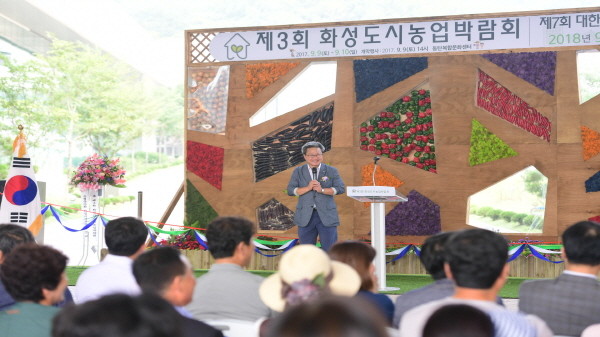 경기 화성시가 지난 9~10일 양일간 동탄복합문화센터 야외광장에서 ‘도시! 농업을 만나 더 행복해지다’라는 슬로건으로 ‘제3회 화성도시농업박람회’를 개최했다. 사진은 행사에 참석한 채인석 시장이 인사말을 하는 모습.(사진제공=화성시청)
