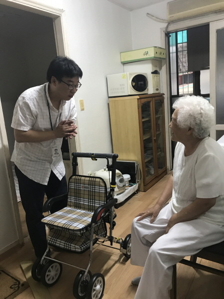 인천 남동구 간석2동 지역사회보장협의체는 최근 인천시 보듬지킴이 사업 추진과 연계해 거동이 불편한 저소득 노인들의 보행에 도움이 되어줄 '사랑의 실버카(성인용 보행기)' 20기를 전달했다. 사진은 관계자가 노인에게 보행기에 대해 설명하는 모습.(사진제공=남동구청)