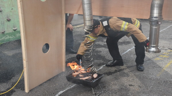 서울 관악소방서는 12일 오전 소방서 후정에서 화재감식 역량강화와 원인 규명률 제고를 위한 화재 재현실험을 실시했다. 사진은 소방관이 연통 화재 실험을 진행 중인 모습.(사진제공=관악소방서)