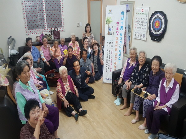 경기 수원시 팔달구 화서1동은 지난 11일 주민자치위원회, 주민자치센터 노래교실 프로그램 수강생과 연계해 지역내 경로당 노인을 대상으로 '효 나눔 재능기부(노래교실, 색소폰 연주 등)'를 실시했다. 사진은 관계자 및 노인들이 기념촬영을 하는 모습.(사진제공=팔달구청)