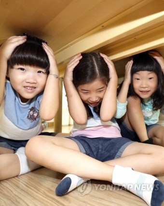 12일 부산 기장군 정관읍 가동유치원에서 열린 지진대피훈련에서 어린이들이 책상 밑에 들어가 몸을 피하고 있다. 부산시가 오는 15일까지 지진안전주간으로 지정함에 따라 82개 기관이 관공서, 학교, 지하철역, 해수욕장, 재래시장, 대형마트 등에서 지진대피훈련을 한다.