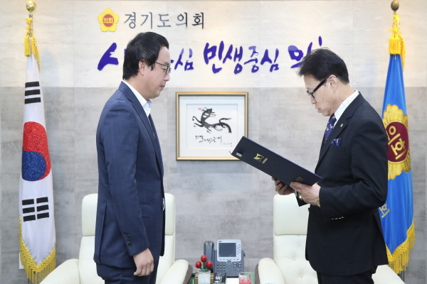 최근 경기도의회 정기열 의장과 임동본 의원이 도의회 의장 접견실에서 경기도 태권도협회 김경덕 회장 등 임원진을 만난 가운데 정 의장이 태권도 종목 저변확대와 발전을 위해 애쓴 공로를 인정받아 김 회장으로부터 명예단증(5단)을 받고 있다.
