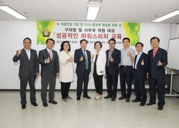구의회에 따르면 이번 교육은 김수범 의원의 추천으로 지난 8일 진행됐으며, 스피치 교육을 통해 효율적인 의사표현과 정책을 효과적으로 전달하고 의사소통 기법을 개선함으로써 구민들과의 유대관계 증진 노력을 위해 마련됐다.