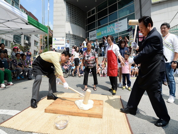 지난 12일 서울 동대문종합사회복지관에서 지역 주민들이 함께 즐기는 '2017 통통축제'가 열렸다. 사진은 유덕열 구청장(왼쪽)이 권혁우 동대문종합사회복지관장과 기념 떡매치기를 하고 있는 모습.