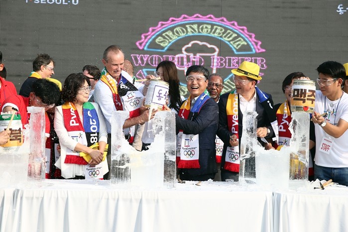 성북구는 최근 성북천 분수마루에서 '세계맥주로 즐기는 건전한 소통의 문화!'를 슬로건으로 내세우고 제2회 세계맥주축제를 개최했다. 사진은 행사에 참석한 김영배 구청장이 12개국 대사 및 관계자 등과 함께 얼음에서 맥주를 꺼내는 퍼포먼스를 하는 모습.