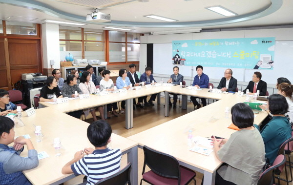 정찬민 경기 용인시장이 지난 12일 처인구 양지면 제일초등학교에서 ‘스쿨미팅’을 열고 노후한 학교시설에 관한 논의를 펼쳤다. 사진은 학생·학부모·교직원들과 논의를 펼치고 있는 정 시장의 모습.(사진제공=용인시청)