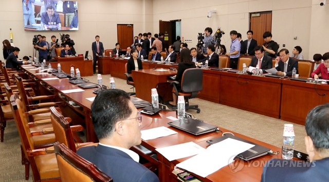 국회 산업통상자원중소벤처기업위원회 장병완 위원장이 13일 오후 열린 산자위 전체회의에서 박성진 중소벤처기업부 장관 후보자에 대한 청문보고서를 상정한 뒤 여당 간사인 홍익표 의원을 제외한 더불어민주당 의원들이 전원 퇴장한 가운데 청문보고서에 관해 토론을 벌이고 있다. /연합뉴스