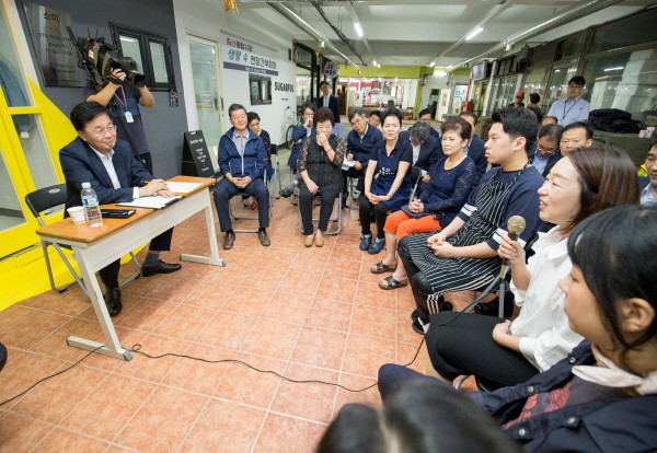 지난 13일 서울 은평구 증산종합시장에서 김우영 구청장과 각 부서의 간부들이 모여 ‘생활 속 현장 간부회의’를 열고 상인들과 관련 주민들의 의견을 청취했다. 사진은 김 구청장(왼쪽)이 상인들과 이야기를 나누고 있는 모습.(사진제공=은평구청)