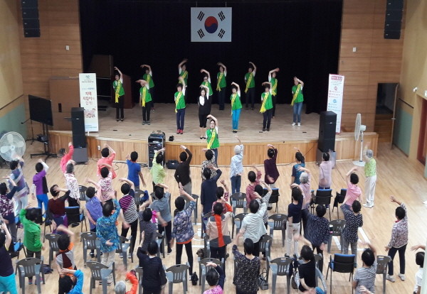 지난 13일 경기 안성시보건소는 치매 극복의 날을 맞아 공도행정복지센터 대회의실에서 치매극복의 날 기념주간 행사를 실시했다. 사진은 행사 참가자들이 춤을 추며 즐거운 시간을 보내고 있는 모습.(사진제공=안성시청)
