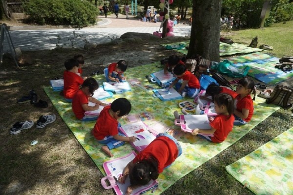 경기 양평군어린이집연합회가 최근 용문산 관광지에서 어린이집 49곳, 영·유아 1500여명이 참가하는 ‘영·유아 사생대회’를 개최했다. 사진은 나무 그늘 밑에서 그림을 그리고 있는 아이들의 모습.(사진제공=양평군청)