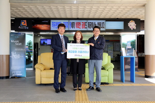 최근 경기 안성시 농아인협회가 시노스(주)로부터 지역내 농아인을 위해 신개발품인 체감음향 리클라이너(150만원 상당)를 기부받았다. 사진은 기부품 전달 후 기념촬영을 하고 있는 관계자들의 모습.(사진제공=안성시청)