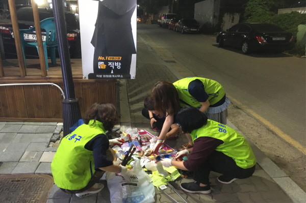 경기 수원시 영통구 원천동 행정복지센터는 최근 '선진영통 문화시민운동' 실천을 위해 '쓰레기 무단투기 상시단속반 부엉이 사업'을 실시했다. 사진은 참여자들이 종량제봉투를 파봉해 쓰레기 분리배출 상태를 점검하는 모습.(사진제공=영통구청)