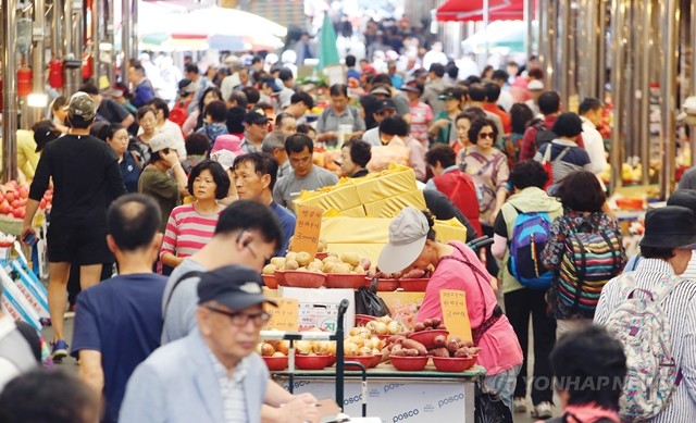 18일 오후 서울 동대문구 청량리청과물시장이 추석을 앞두고 장을 보러 나온 시민들로 북적이고 있다. 최근 농수산식품공사가 추석 차례상 차림 비용을 조사한 결과 전통시장이 대형마트보다 18%가량 적게 드는 것으로 나타났다.