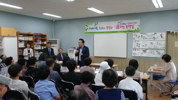 이재호 인천 연수구청장은 최근 치매노인 가족의 아픔과 어려움을 공감하고 지지하기 위해 ‘아사모(아름다운 사람들의 모임)’ 회원 30여명과 치매주간보호센터 가족모임 회원 10여명 등과 함께 연수구치매통합센터를 찾았다. 사진은 이 구청장이 인사말을 하는 모습.(사진제공=연수구청)