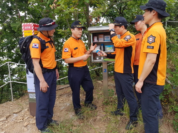 경기 동두천소방서는 지난 19일 오전 관광객들이 많이 찾는 소요산 일대를 순회하며 가을철 산악사고 대비를 위한 안전 점검을 실시했다. 사진은 선병주 서장 및 소방관들이 산악표지판 및 구급함 응급물품을 점검하는 모습.(사진제공=동두천소방서)