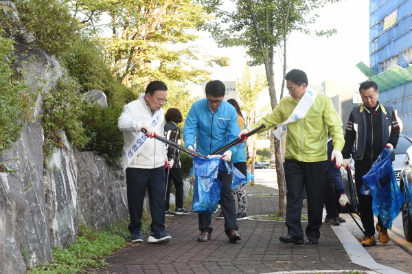 지난 20일 경기 양주시가 추석명절과 천만송이 천일홍축제를 대비해 고읍동 일원에서 가로환경정비를 추진했다. 사진은 이성호 시장(왼쪽) 및 참가자들이 인도에 버려진 쓰레기를 수거하고 있는 모습.(사진제공=양주시청)