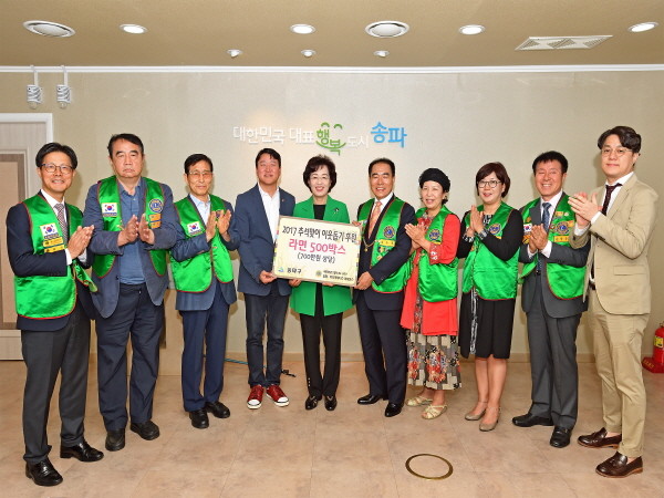지난 20일 서울 송파구가 송파·더디자이너스 라이온스로부터 다가오는 추석 명절을 맞아 700만원 상당의 라면 500상자를 이웃돕기 성품으로 전달받았다. 사진은 박춘희 구청장(가운데)이 구청장실에서 성품을 전달받고 기념촬영을 하는 모습.(사진제공=송파구청)