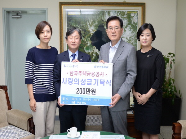 지난 20일 동대문구가 한국주택금융공사 서울동부지사로부터 복지 사각지대에 놓인 소외계층을 돕기 위한 성금 200만원을 기탁받았다. 사진은 유덕열 구청장(오른쪽에서 두번째)과 이주용 지사장(왼쪽에서 두번째)이 기념촬영을 하는 모습.(사진제공=동대문구청)