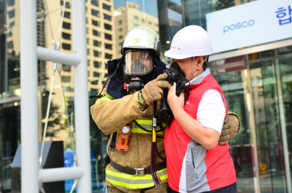 서울 강남소방서는 21일 오후 포스코센터(강남구 대치동 소재)에서 고층건물 화재를 대비한 소방훈련을 실시했다. 사진은 소방관들이 인명구조 훈련을 진행 중인 모습.(사진제공=강남소방서)