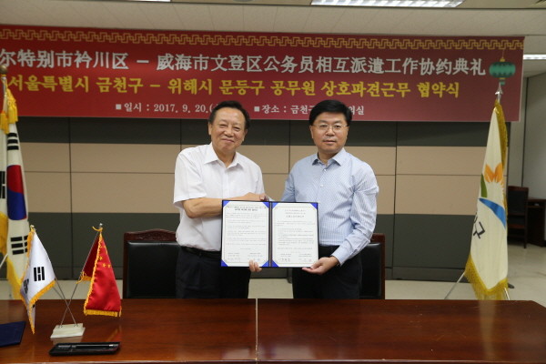 금천구는 지난 20일 오후 6시 구청 대회의실에서 중국 산둥성 위해시 문등구와 ‘서울특별시 금천구-중국 위해시 문등구 공무원 상호파견근무 협약’을 체결했다. 사진은 차성수 구청장(왼쪽)과 문등구 임헝(林恒) 구청장이 기념촬영을 하는 모습.(사진제공=금천구청)
