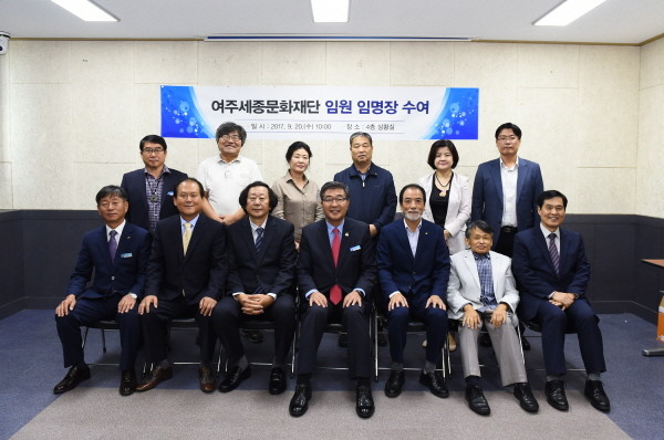 최근 경기 여주시는 시청 상황실에서 여주세종문화재단 상임이사를 비롯해 재단 비상임 이사·감사 등의 임원이 참석한 가운데 임원회의를 개최하고, 임원 13명에게 임명장을 수여했다. 사진은 회의 종료 후 원경희 시장(가운데) 등 관계자들이 기념촬영을 하는 모습.(사진제공=여주시청)