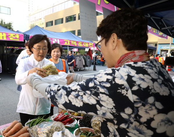 지난 21일 서울 강남구청 주차장에서 연말 홀몸노인 난방비 지원을 위한 ‘강남구여성단체연합회 바자회’가 개최됐다. 사진은 바자회를 방문한 신연희 구청장이 물건을 구매하고 있는 모습.(사진제공=강남구청)