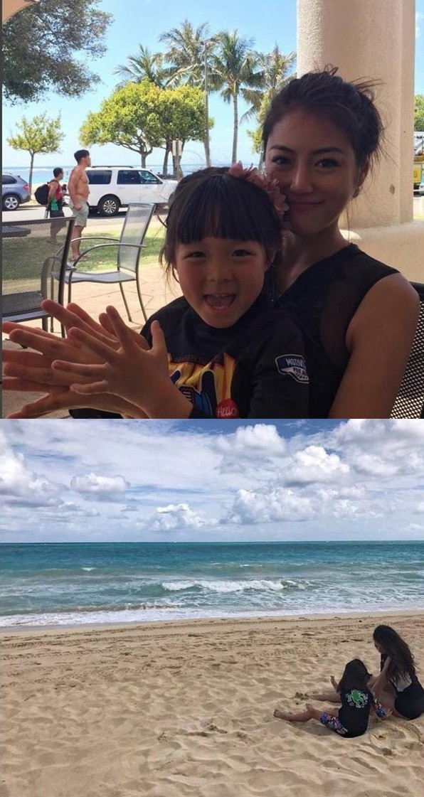 정다래는 무릎 위에 추사랑을 앉히고서 카메라를 향해 밝은 표정을 짓고 있으며 추사랑 또한 두 손을 맞댄 체 사랑스러운 웃음을 짓고 있다.