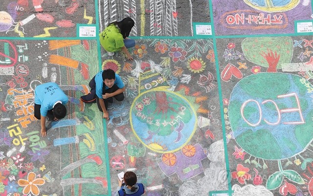 24일 오전 ‘서울 차 없는 날 2017’ 행사가 열린 서울 시청 앞 도로에서 에너지 수호 천사단 회원들이 그라피티를 그리고 있다.