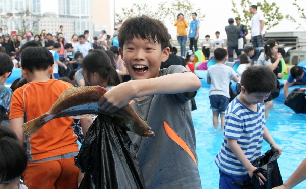 지난 23~24일 양일간 동작구 노량진수산시장 일대에서 열린 ‘6회 도심 속 바다축제’에 30만명의 인파가 몰렸다. 사진은 활어 맨손잡기 행사에 참여한 어린이가 광어를 잡은 후 즐거워 하는 모습.(사진제공=동작구청)