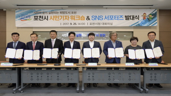 경기 포천시는 지난 25일 시청 대회의실에서 시민과 소통할 수 있는 다양한 콘텐츠를 취재하고, 시정 소식을 전하는 데 앞장설 ‘SNS 서포터즈’의 발대식을 개최했다. 사진은 김종천 시장(왼쪽에서 네번째) 등의 관계자들이 발대식 후 기념촬영을 하는 모습.(사진제공=포천시청)