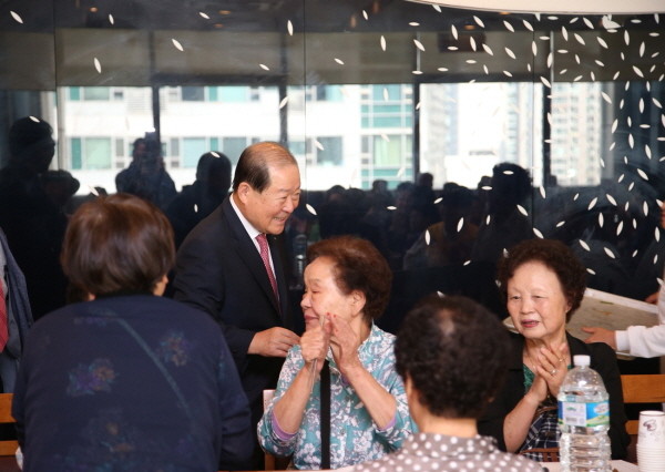 지난 25일 오전 박홍섭 마포구청장이 지역내 위치한 이룸웨딩컨벤션 6층에서 진행된 적십자 한가위 사랑의 송편 나눔 잔치에 참석해 노인들과 반갑게 인사를 하고 있다.(사진제공=마포구청)