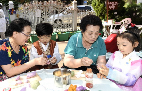 서울 광진구가 지난 26일 중곡2동에 소재한 수호천사어린이집 앞마당에서 ‘송편 드시고 풍성한 한가위 되세요’ 행사를 개최했다. 사진은 행사에서 어린이와 노인이 함께 송편을 빚는 모습.(사진제공=광진구청)