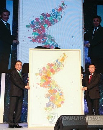 문재인 대통령이 27일 오전 서울 잠실 롯데호텔월드에서 열린 제11회 세계한인의 날 기념식 및 2017 세계한인회장대회 개회식에서 최영근 독일 비스바덴 한인회장으로부터 평화를 기원하며 독일 어린이들이 손지장을 찍어 만든 한반도 지도를 선물 받고 있다.