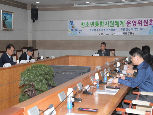 경기 동두천시는 지난 27일 오전 11시 시청 상황실에서 '2017년 하반기 동두천시 지역사회 청소년통합지원체계 운영위원회' 정기회의를 개최했다. 사진은 시 자치행정국장을 비롯한 위원들이 회의하는 모습.(사진제공=동두천시청)