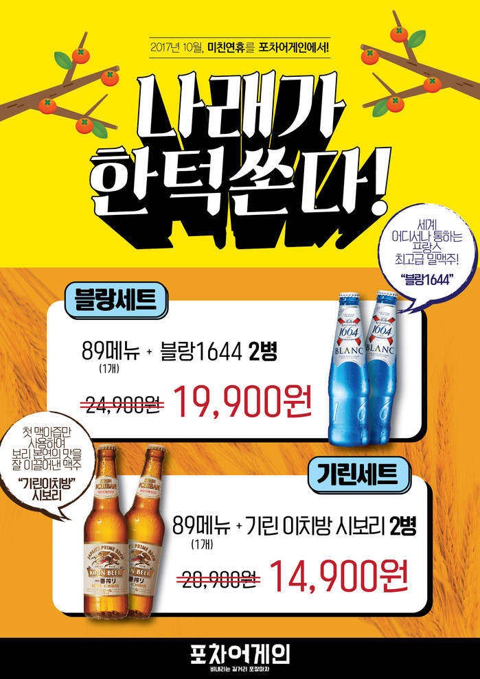 이벤트 기간 중 프랑스 최고급 밀맥주인 ‘크로넨버그 1664 블랑’ 2병과 포차어게인의 89메뉴 1개를 결합한 ‘블랑세트’를 19,900원(정가 24,900원), 그리고 ‘기린 이치방 시보리 2병과 포차어게인의 89메뉴 1개를 결합한 ‘기린세트’를 14,900원(정가 20,900원)의 할인된 가격으로 즐길 수 있다는 것이 회사 측 설명이다.