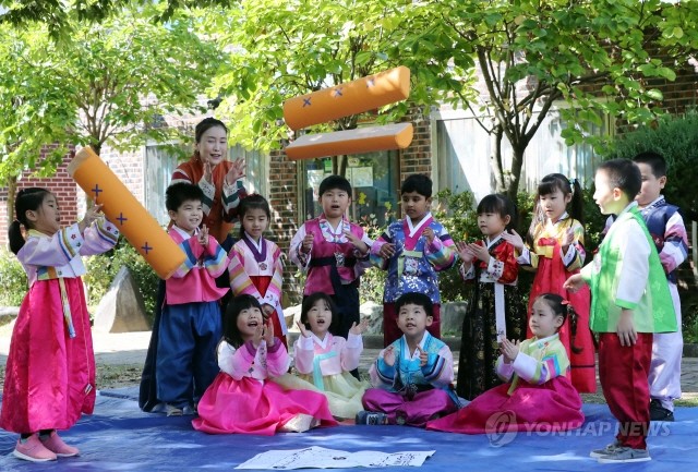 추석 황금연휴 시작을 이틀 앞둔 28일 오전 광주 북구 중흥어린이집에서 어린이들이 한복을 입고 윷놀이하고 있다.