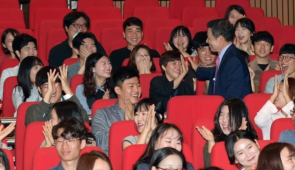 | ▲ 2017 광주시 신규 임용 후보자들과 공감토크에 나선 윤장현 광주광역시장(사진, 앞에서 5줄)이 이들과 하이파이브를 나누고 있다. | ||