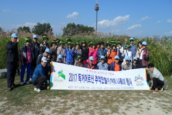 서울 은평구 신사제1동이 ‘제21회 노인의 날’을 맞아 찾아가는 동주민센터와 연계해 야외활동이 쉽지 않은 지역내 홀몸노인 30여명을 대상으로 마포구 성산동 하늘공원에서 '홀몸노인 추억 만들기 야외나들이 행사'를 실시했다. 사진은 참가자들이 기념촬영을 하는 모습.(사진제공=은평구청)