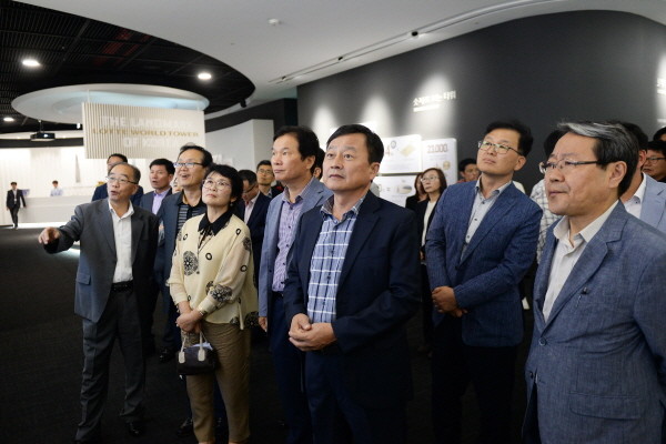 지난 11일 동대문구 강병호 부구청장(오른쪽에서 세 번째)과 구청 재난안전대책본부 13개 실무반 과장 등이 송파구 롯데월드타워를 방문해 안전 시설 견학을 실시했다. 사진은 롯데월드타워 홍보관을 살펴보고 있는 강 부구청장과 직원들의 모습.(사진제공=동대문구청)