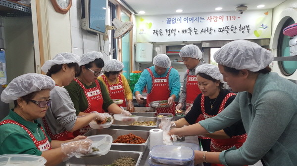 경기 수원시 권선구 평동은 새마을부녀회와 함께 지난 11일 ‘사랑의 119 반찬 나눔’ 행사를 진행했다. 사진은 참여자들이 깻잎조림, 무장아찌, 장조림, 멸치볶음 등을 만들고 있는 모습.(사진제공=권선구청)
