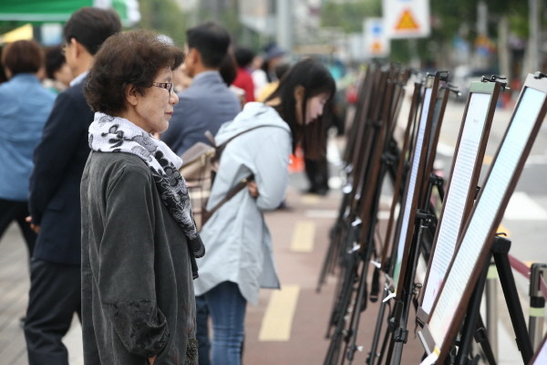 성북구가 지난 12일 오전 11시 성북천 바람마당에서 제571돌 한글날 기념 문화축제 ‘2017 성북문학제’를 개최했다. 사진은 행사장에 전시된 작품을 감상하고 있는 구민들의 모습.(사진제공=성북구청)