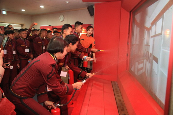지난 12일 필리핀 국립경찰대학교 학생들이 소방활동의 전반적인 체계와 운영 시스템 등을 알아보기 위해 동작소방서를 방문했다. 사진은 학생들이 소화기 사용 실습을 하는 모습.(사진제공=동작소방서)