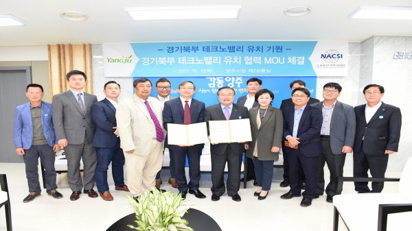 지난 12일 경기 양주시가 (사)한국인지과학산업협회와 시청 제2상황실에서 경기북부테크노밸리 유치를 위한 양해각서 체결하고 경기북부테크노밸리의 양주시 유치에 뜻을 모았다. 사진은 이성호 시장(오른쪽에서 다섯번째)이 관계자들과 기념촬영을 하고 있는 모습.(사진제공=양주시청)