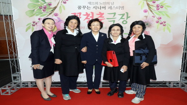 지난 12일 서울 강남구 코엑스에서 ‘제21회 노인의 날 기념행사’가 개최됐다. 사진은 행사에 참여한 신연희 구청장(가운데)이 행사 참가 노인들과 함께 기념촬영을 하고있는 모습.(사진제공=강남구청)