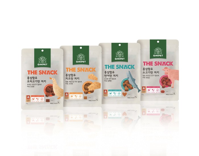 신제품 ‘지니펫 더스낵’은 총 4종으로 ‘홍삼함유 소고기맛 저키’, ‘홍삼함유 오리고기맛 저키’, ‘홍삼함유 연어맛 저키’, ‘홍삼함유 치즈맛 저키’다.