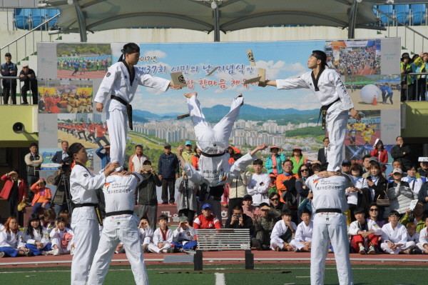 경기 동두천시는 지난 14일 시 종합운동장에서 '제37회 시민의 날' 기념식과 '시민화합 한마음 체육대회' 행사를 개최했다. 사진은 행사에서 제3야전군사령부의 태권도 시범이 펼쳐지는 모습.(사진제공=동두천시청)