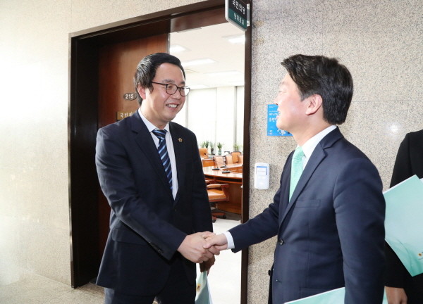 정기열 경기도의장(왼쪽)이 전국시도의회의장협의회 제15대 후반기 임원진 구성에 따른 상견례를 위해 16일 국회 국민의당 대표실을 방문, 안철수 대표와 악수를 나누고 있다. 정 의장은 전국시도의회의장협의회 사무총장을 맡고 있다. (사진제공=경기도의회)