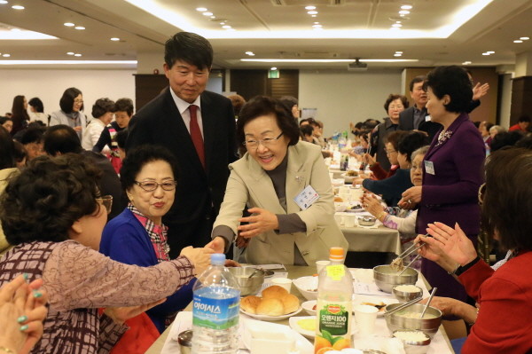 신연희 서울 강남구청장은 지난 16일 오전 압구정동 마이에가든에서 열린 ‘압구정동 어르신 경로잔치’에 참석해 노인들의 건강을 기원했다. 사진은 행사에 참석한 신 구청장이 지역노인들과 인사를 나누고 있는 모습.(사진제공=강남구청)
