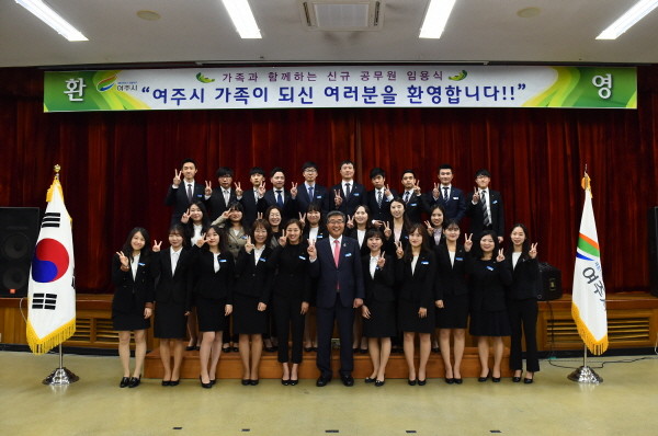 최근 경기 여주시가 시청 대회의실에서 공직에 첫발을 내딛는 신규공무원 27명에 대한 임용식을 개최했다. 이날 임용식에는 신규 공무원들의 가족이 함께 참여했다. 사진은 임용식 후 기념촬영을 하고 있는 공무원들의 모습.(사진제공=여주시청)